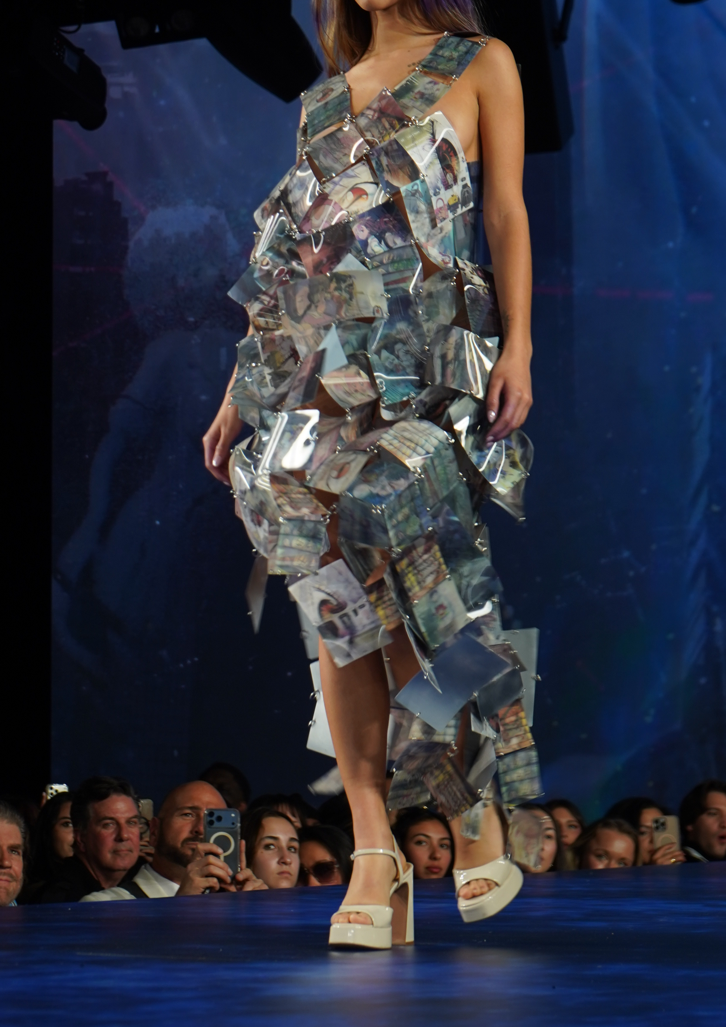 The show opened with a lenticular anime card dress created from @animefashion.archives screenshots and Cheng’s own images of real-life anime fashion. Each card featured three moving visuals.