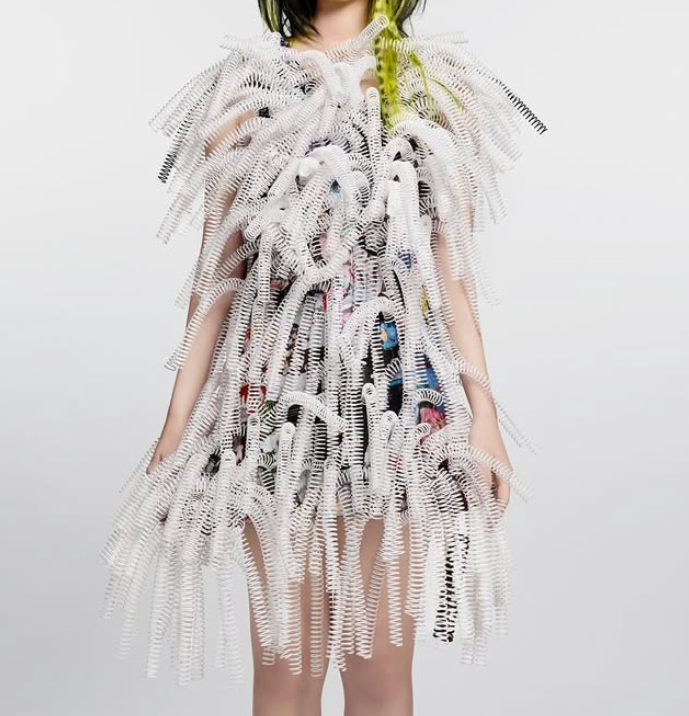Taking upcycling to an extreme, Cheng’s work transforms discarded materials into garments through zero-waste knitwear and digital patternmaking, positioning knitwear as both a technical and conceptual medium according to her press materials.